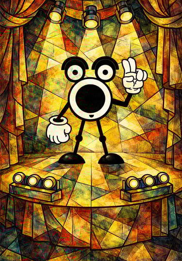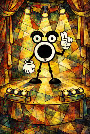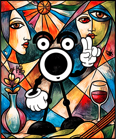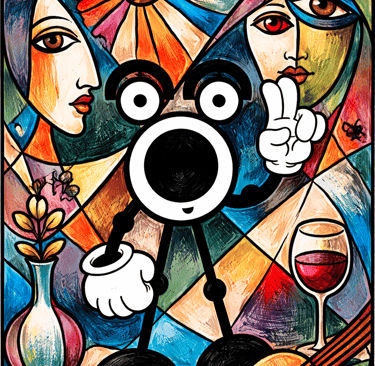 L'image à l'’écran de son portable vacilla un bref moment, puis un personnage étrange apparut en pleine page. Entièrement noir, dessiné d’un trait simple et stylisé, il semblait surgir d’un univers régi par une logique visuelle unique. Son corps était formé d’un large point noir cerclé de blanc — un point amplifié, véritable cœur visuel et conceptuel de sa structure. Deux yeux ronds flottaient au-dessus, fixant l’utilisateur avec un air à la fois ahuri et comique. Ses bras et jambes, allongés et articulés par des points, se terminaient par des formes ovoïdes noires : des points scindés en deux, posés au sol comme une extension naturelle de son identité graphique.